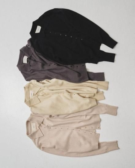 柔らかなラクーンウール混糸を使用したニットカーディガン。肌に溶け込むような着心地の良さが魅力。身頃はフラットな表情の天竺編み、フロントには表地と同色の華奢なボタンをあしらい、全体的に無駄を削ぎ落としたミニマルなデザインに仕上げました。ゆったりとしたシルエットで、ボタンを少し開けて着るだけで抜け感のあるスタイリングに仕上がる一枚です。