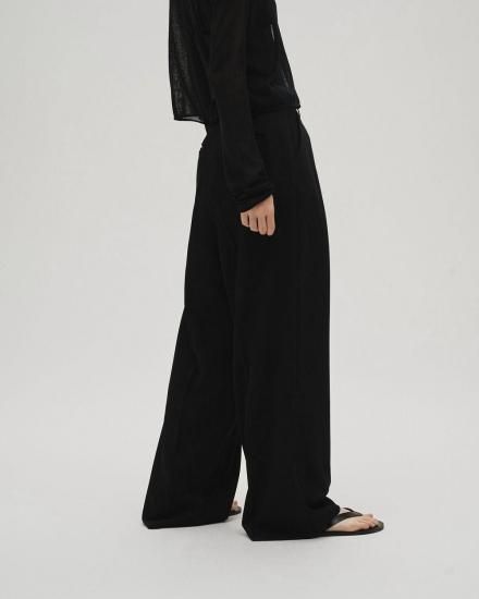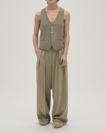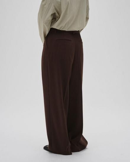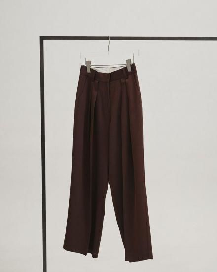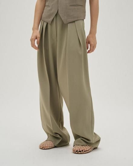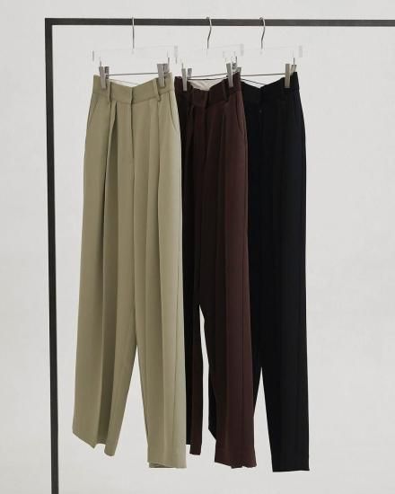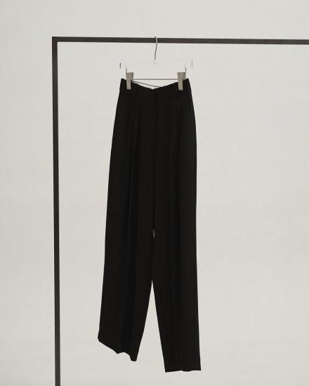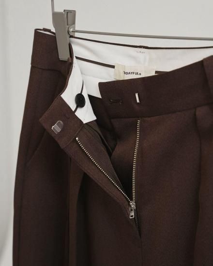 国内の上質な生地を使用したトラウザーズ。ウールのような上品でなめらかな風合いながら、ポリエステルを多く使用しているので、長いシーズン快適に着用できます。程よいシャリ感があり、ワイドシルエットでも軽やかにまとまるのが魅力。シンプルなデザインでどんなスタイリングにも馴染む一枚です。