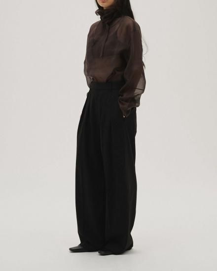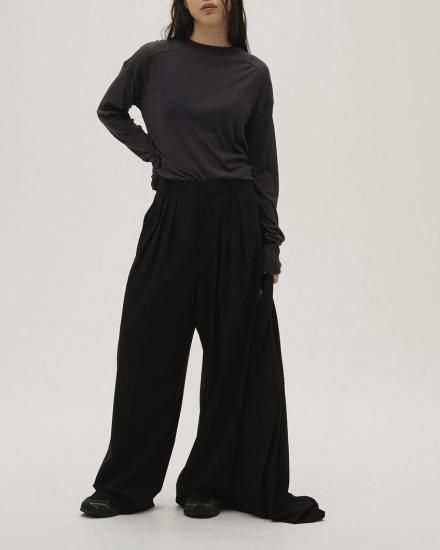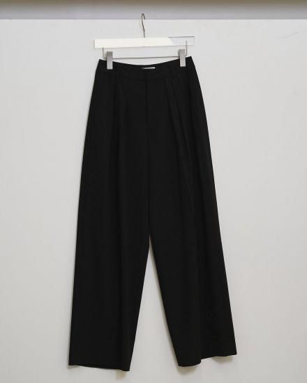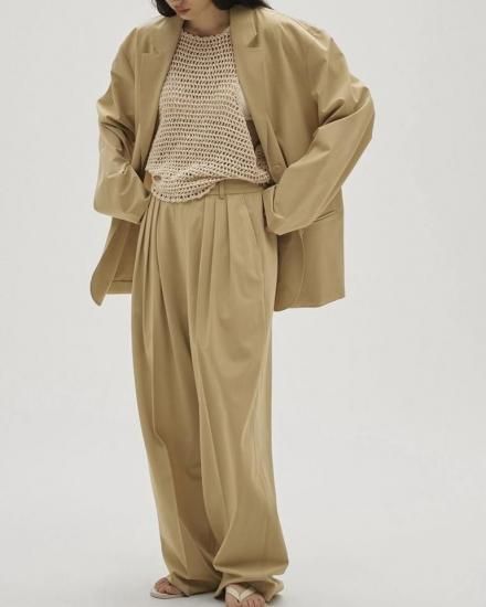 さらりとした質感と上品な表情を持つ生地を使用したトラウザーズ。軽やかな穿き心地と、深めのタックが生み出すワイドシルエットが魅力。トップスのバランスを選ばず、様々なスタイルに馴染む一枚です。同じ生地を使用したDry Touch Rough Jacket とセットアップでマニッシュに着こなすのもおすすめです。