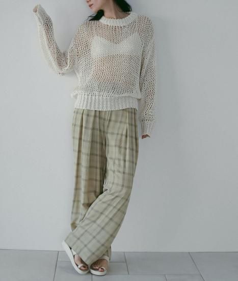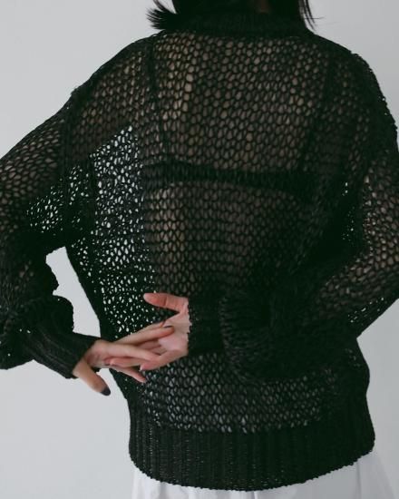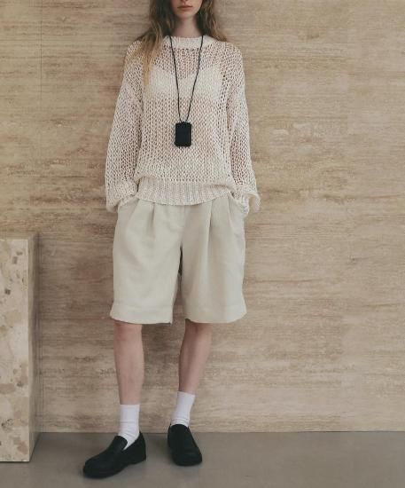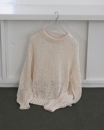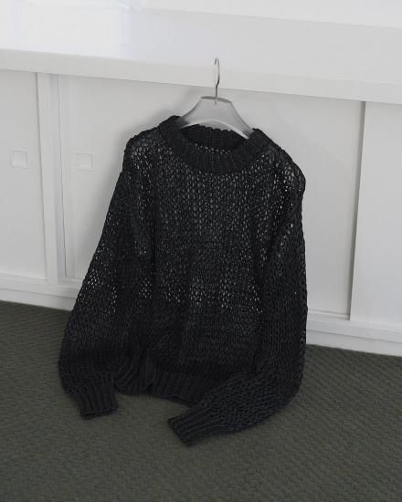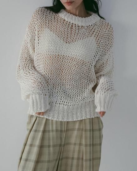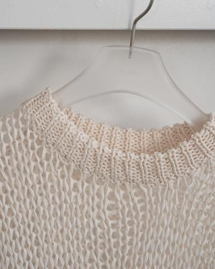 細番手の糸を並べて貼り合わせ、テープのように仕上げた糸をルーズに編み上げたオーバーニット。シンプルなデザインながら、コーディネートに映える特長的な編み地がスタイリングに映える一着。コットン混のドライタッチな風合いと軽い仕上がりで、春夏に心地良く着ていただけます。