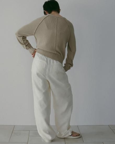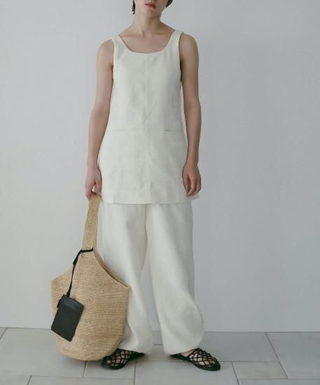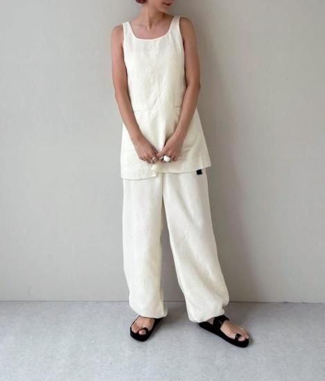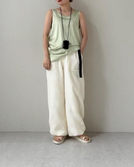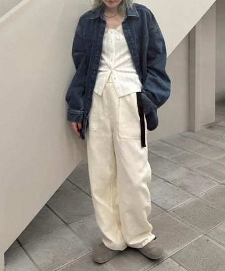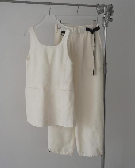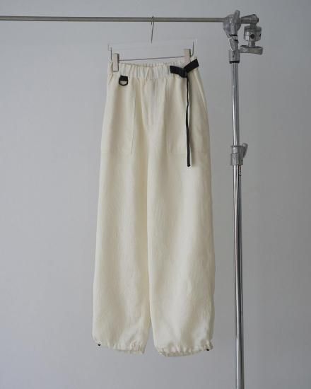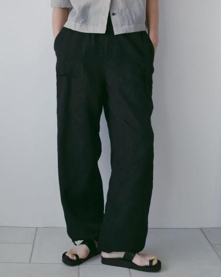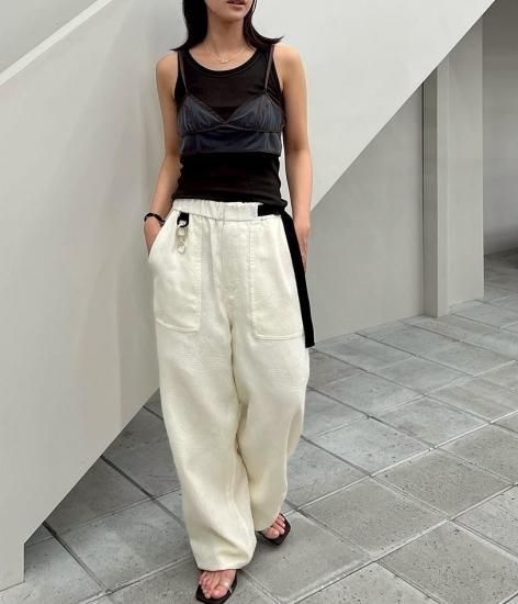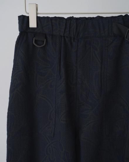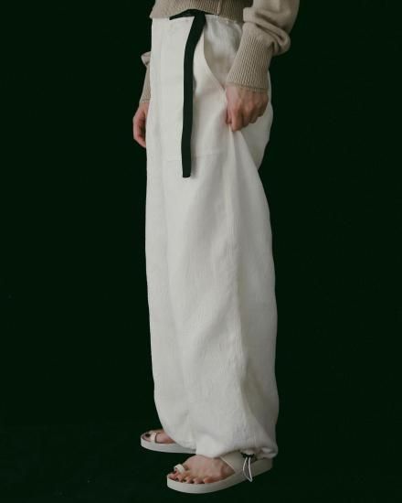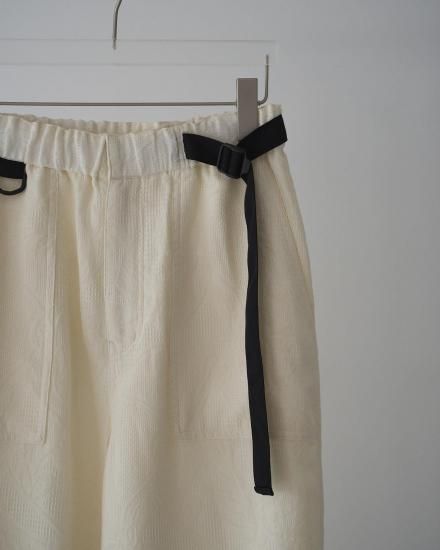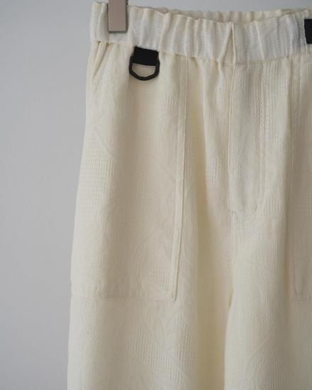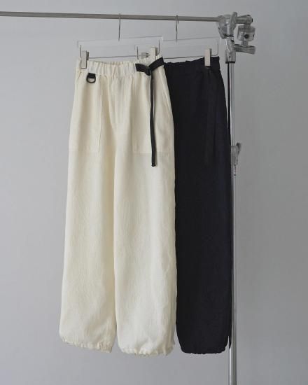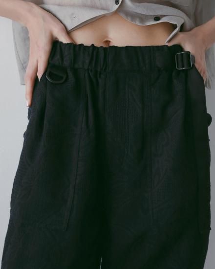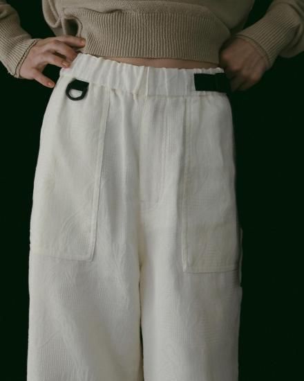 国内で織り上げたオリジナルのジャカード素材を使用したラフパンツ。ワントーンで仕上げた大柄を立体的に織り上げ、奥行きある生地に仕上げています。ステッチを効かせたパッチポケットデザインと、ウエストのテープやバックル使いがポイント。カジュアルなデザインとジャカード素材のコンビが新鮮見えする一本。裾は絞れるゴムドロストデザイン。シンプルなトップスと合わせるだけでも、コーディネートにさりげない華を添えてくれます。同素材のJacquard Square Tunicとセットアップで着ていただくのもおすすめ。簡単にスタイリングが完成し、よりこなれた着こなしに。