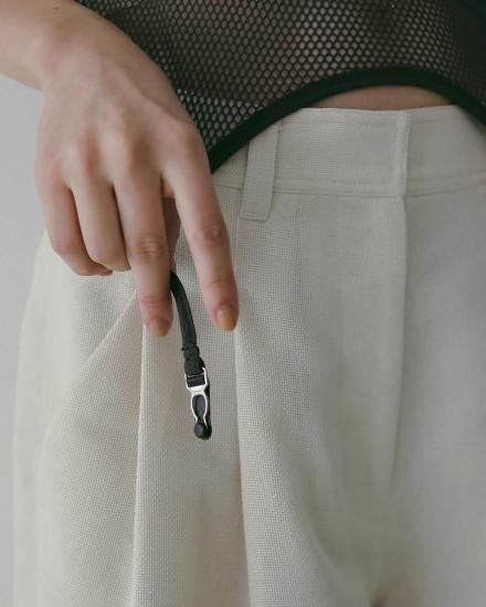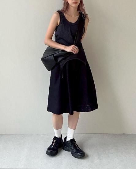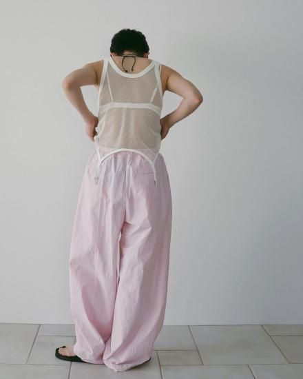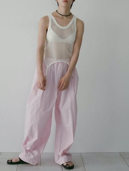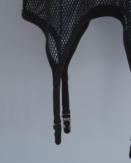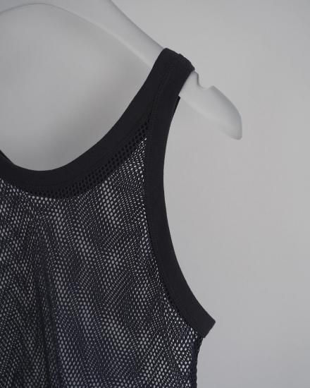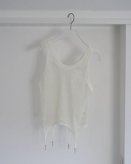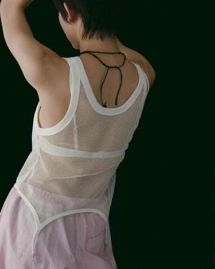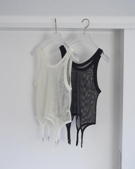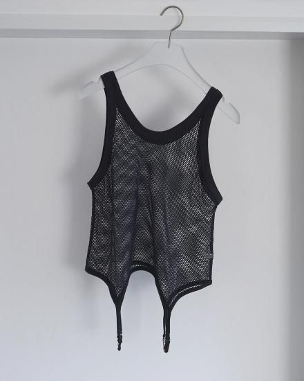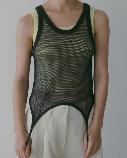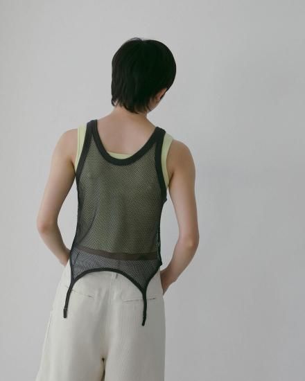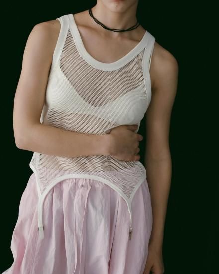 メッシュ素材を使用したデザインタンクトップ。コーディネートに一癖プラスしてくれるガーターデザインが、モードな印象の一枚。透け感のあるメッシュに、タンクやTシャツなどを重ねて、いろんなレイヤードスタイルをお楽しみください。春夏らしいカラーパレットで遊ぶのもおすすめです。