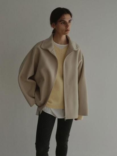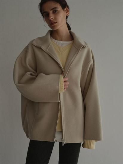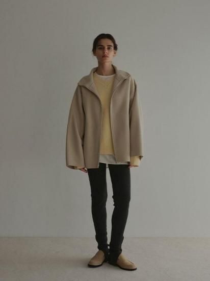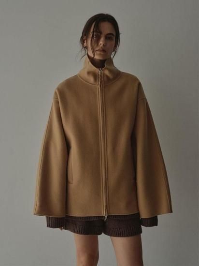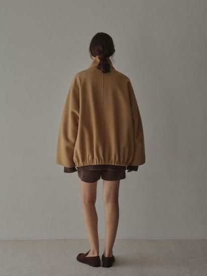 立ち上がったスタンドネックが顔まわりに洗練感を添え、丸みのあるドルマンスリーブと、 後ろにギャザーを施した裾のディテールがほどよいボリュームを演出。